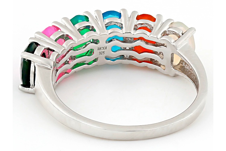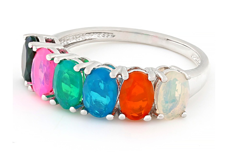 1.20ctw Oval White, Orange, Paraiba Blue, Green, Pink, and Black Ethiopian Opal Rhodium Over Sterling Silver Ring. Measures Approximately 0.84"L x 0.24"W. Not Sizeable.