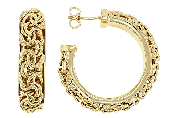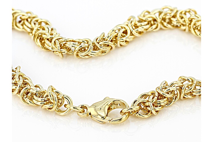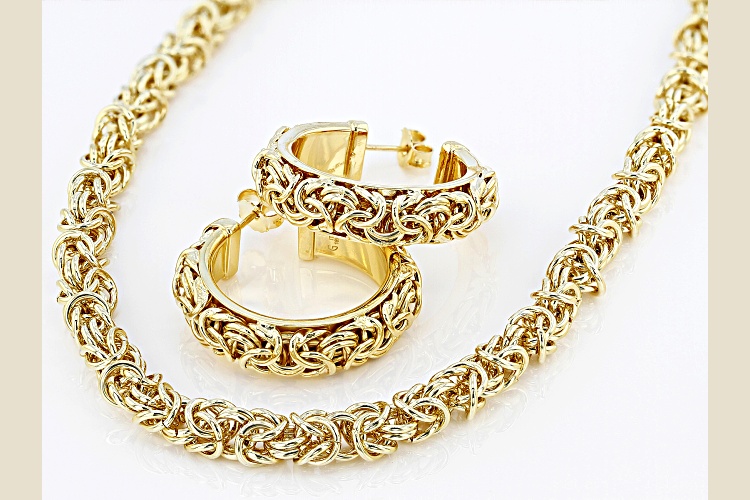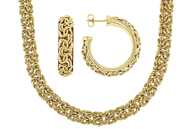 Moda Al Massimo® 18k yellow gold over bronze byzantine link necklace and hoop earring set of two. In this set you will receive one 20 inch necklace measuring approximately 1/4 of an inch in width, 6.5mm gauge, and has a lobster claw clasp. You will receive one pair of byzantine hoop earrings measuring 1 5/16"L x 1 3/16"W and have push back closures.
