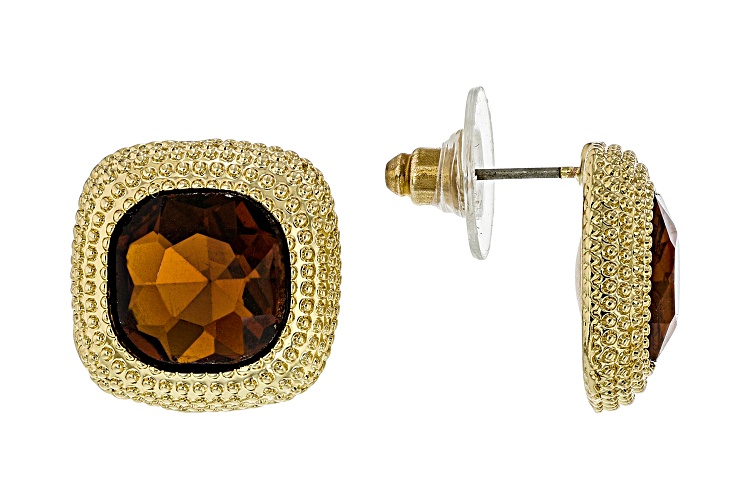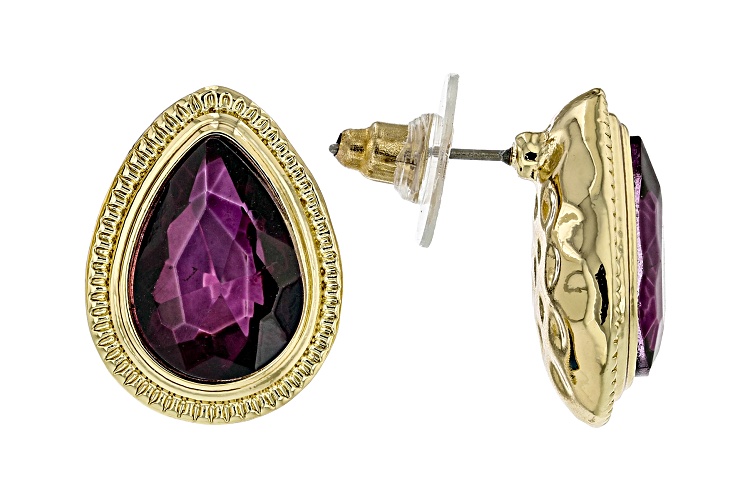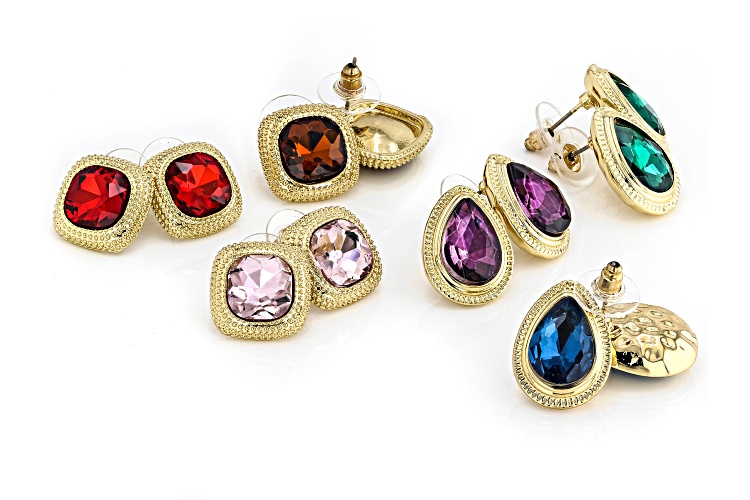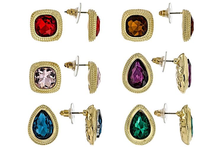 Off Park® Collection, Light Pink Kunzite Color, Long Blue Topaz Color, Madeira Citrine color, Emerald Color, Ruby Color, and Amethyst Color Crystal Gold Tone Set of 6 Earrings. Bullet Backings. Square Cushion Earrings, 10mm Crystal, Measure Approximately 0.61"L X 0.61"W. Pear Shaped 14x10mm Crystal Earrings Measure Approximately 0.81"L x 0.62"W.Bullet Backings. Includes Giftable Pouch.