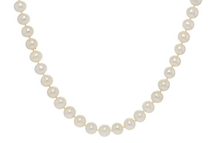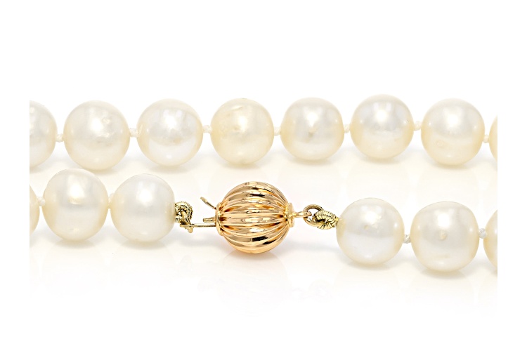 8.5-9.5mm white cultured freshwater pearl, 14k yellow gold, 24 inch strand necklace. Measures approximately 5/16" of an inch in width, with a bead clasp closure. Color/shape/size varies.