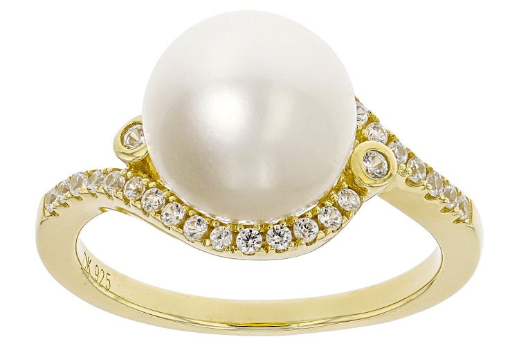 9-10mm White Cultured Freshwater Pearl and White Zircon 18k Yellow Gold Over Sterling Silver Ring - Size 12
