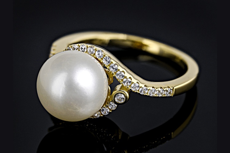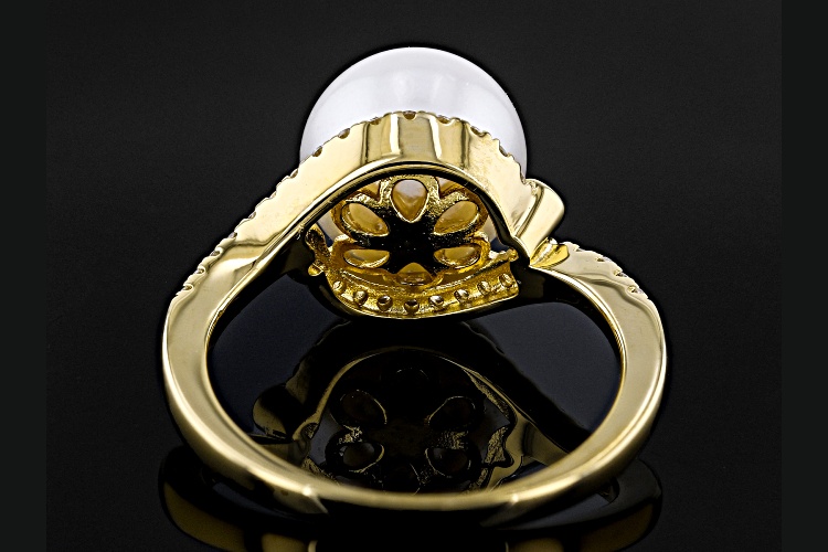 • 9-10mm White Cultured Freshwater Pearl and White Zircon 18k Yellow Gold Over Sterling Silver Ring - Size 12