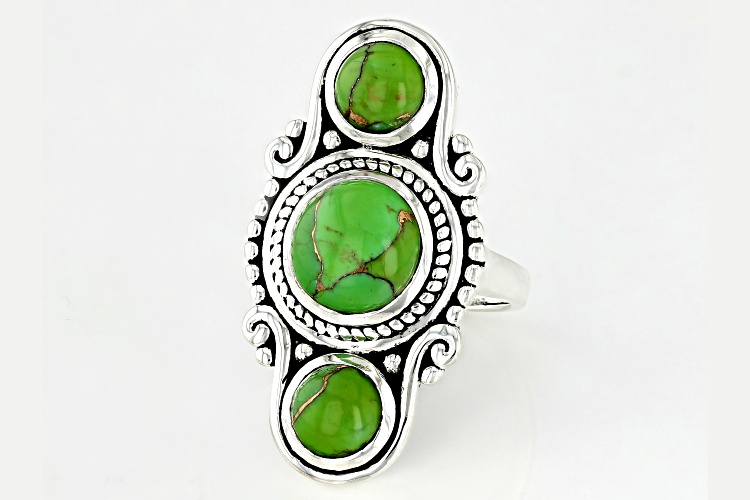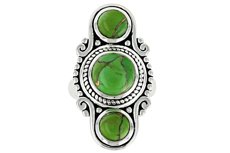 Southwest Style by JTV™ 10mm & 7mm Round Green Composite Turquoise Sterling Silver 3-Stone Ring. Measures approximately 0.71"L x 1.35"W. Not sizeable. Finished under gallery. This product contains composite turquoise. This means separate pieces of turquoise were bound together.