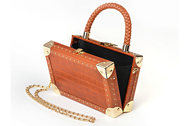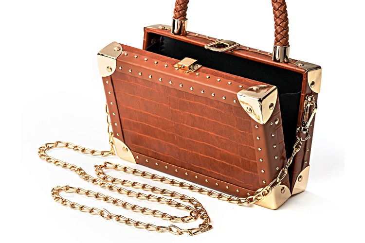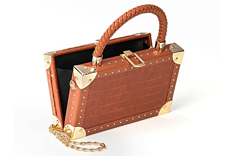 Off Park® Collection, Gold Tone Imitation Brown Leather Clutch. Measures Approximately 8.5"L x 7.5"W. Includes Approximately 46" Chain with Carabiner Closure.