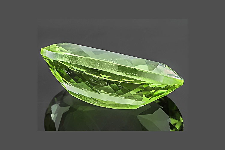 Pakistani peridot 5.98ct 13.82x10.88mm oval checkerboard cut. Gemstone mined in Pakistan and cut in China.