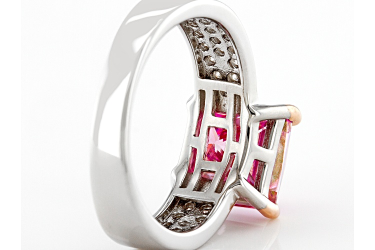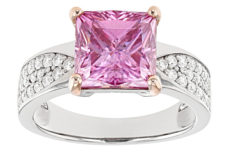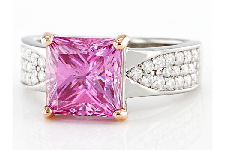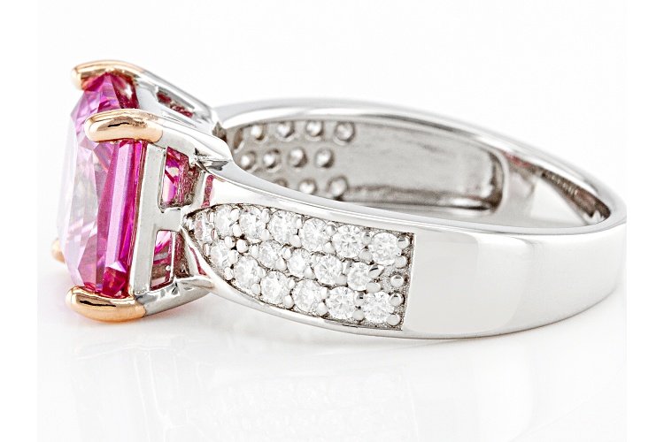 Moissanite Fire(R) and pink moissanite 3.54ctw diamond equivalent weight princess cut and round, Platineve(R) ring. 14k rose gold over silver prongs. Measures approximately 5/16" L x 1/16" W and is not sizeable. Actual moissanite weight is 3.21ctw.