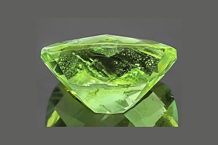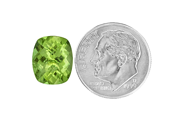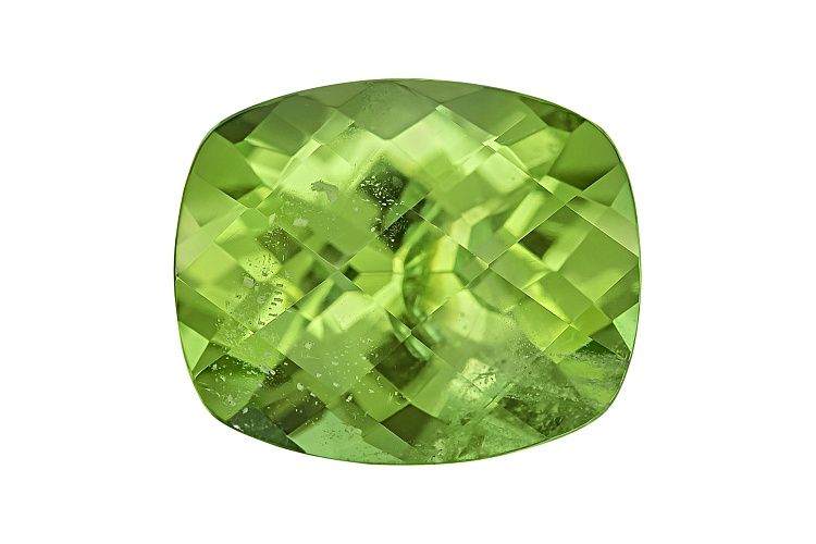 Pakistani peridot 4.80ct 11.5x9.5mm rectangular cushion checkerboard cut. Gemstone mined in Pakistan and cut in China.