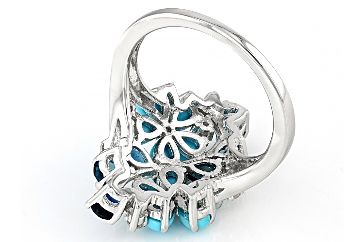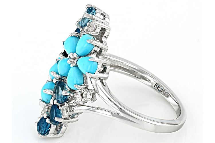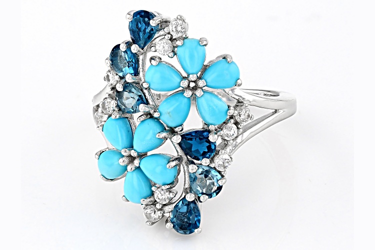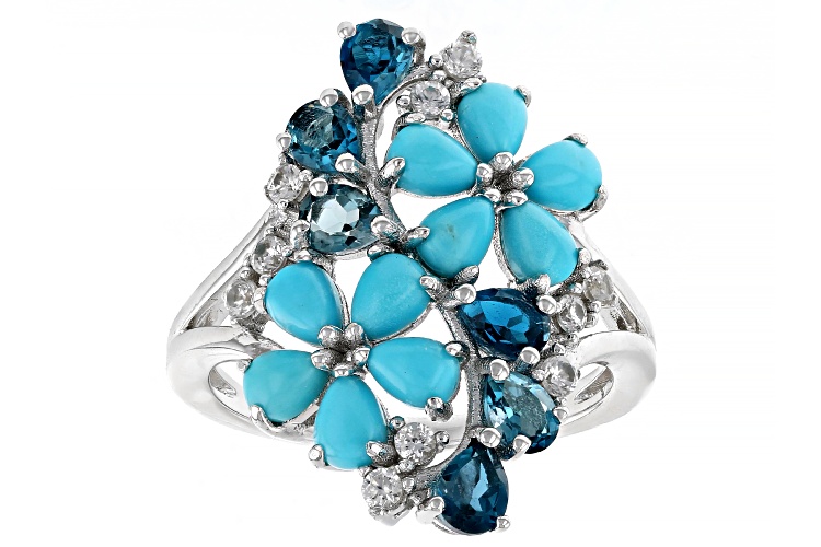 • 4x3mm Sleeping Beauty Turquoise,.92ctw London Blue Topaz, .34ctw zircon Rhodium Over Silver Ring - Size 5