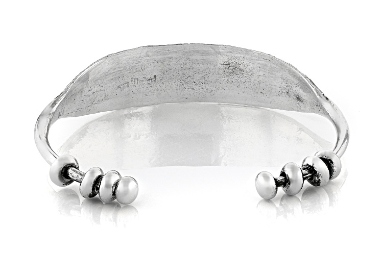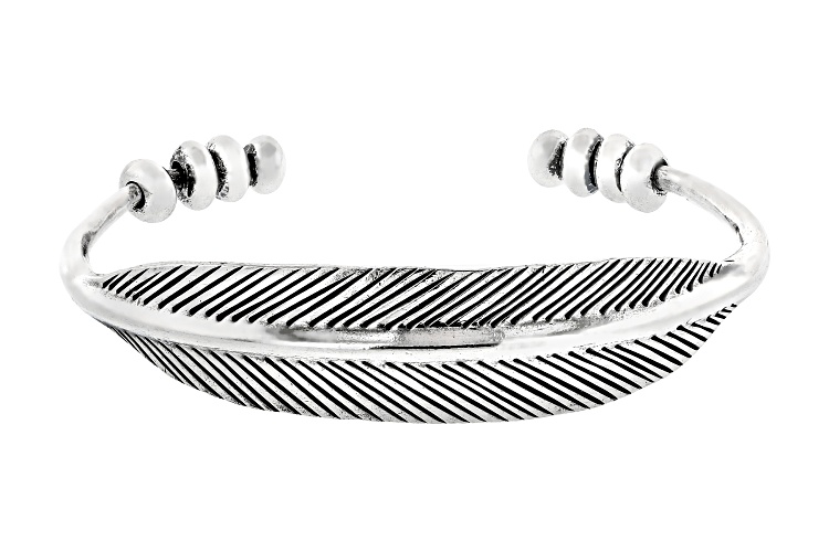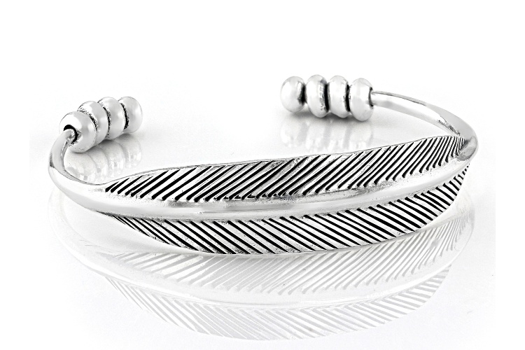 Sterling Silver Feather Cuff Bracelet. Measures approximately 9/16 of an inch in width and has no closure.