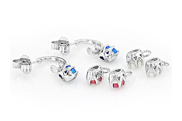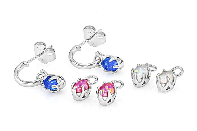 6x4mm Oval Lab Blue, Lab Pink, Lab White Opal Rhodium Over Silver Interchangeable Earrings