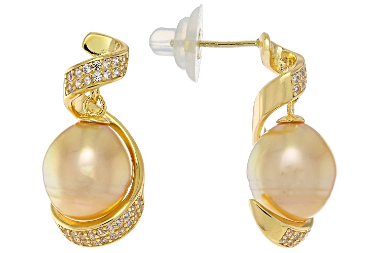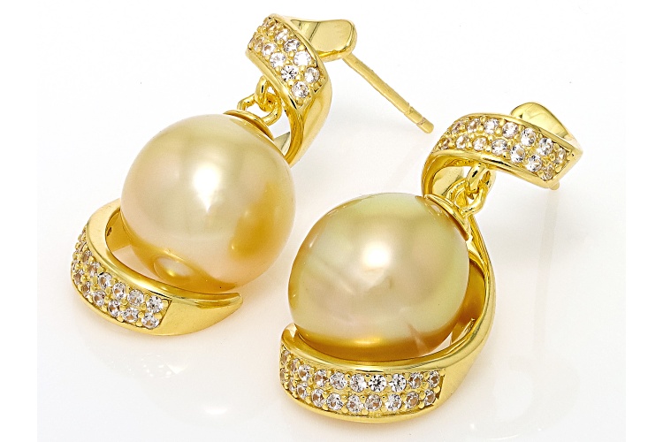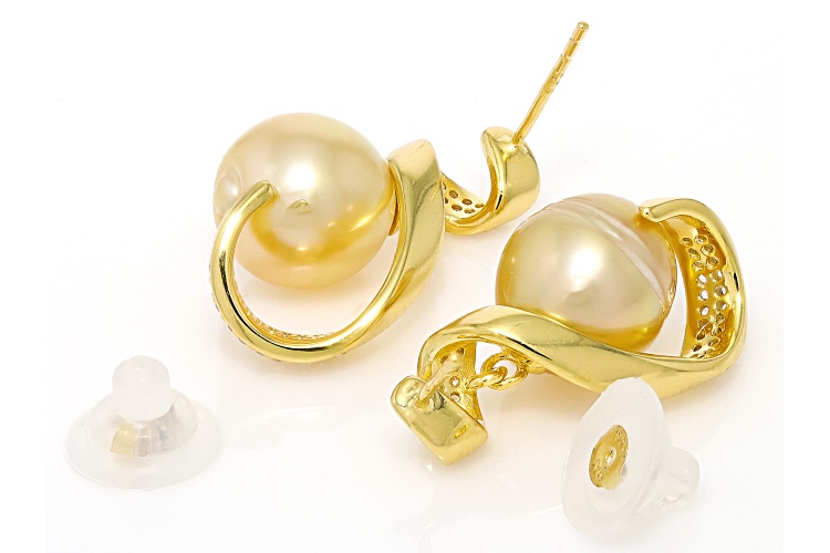 10-11mm Golden Cultured South Sea Pearl & 0.61ctw White Zircon 18k Gold Over Silver Earrings