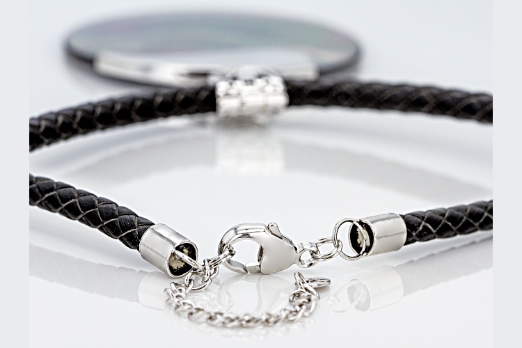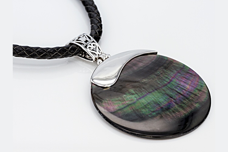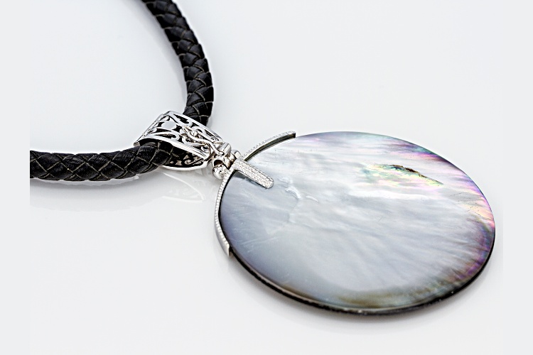 Pacific Style™ 50mm round black mother-of-pearl rhodium over sterling silver enhancer with 20" leather cord. Measures approximately 2.69"L x 2"W. 6mm bail. 2" extender.