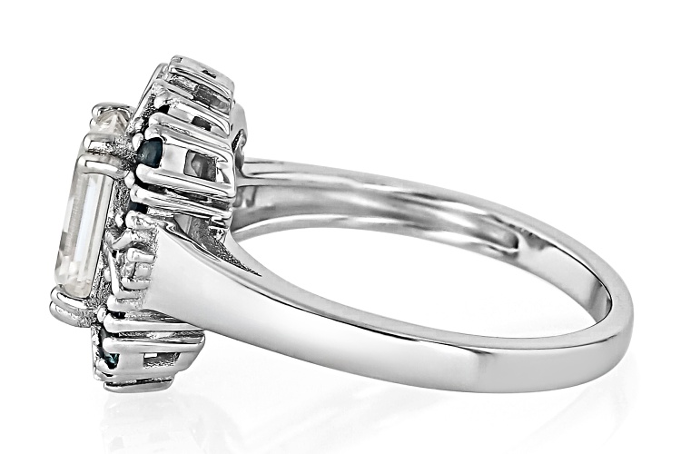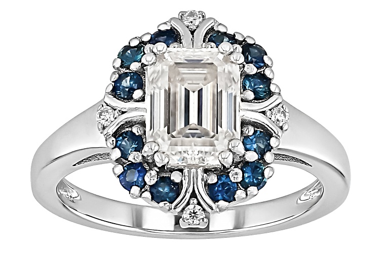 Moissanite Fire(R) 1.79ctw diamond equivalent weight emerald cut and round brilliant with 0.54ctw round blue sapphire, Platineve® ring. Measures approximately 7/16" L x 1/2" W and is not sizeable. Actual moissanite weight is 1.64ctw.