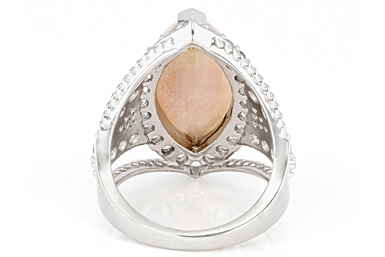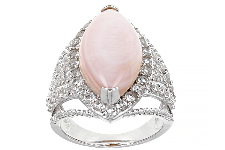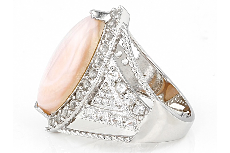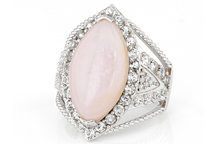 Pink mother-of-pearl with 1.60ctw white topaz and 0.11ctw white zircon rhodium over sterling silver ring. Measures approximately 13/16" L x 1" W and is not sizeable. Colors, shapes, and sizes may vary. Accent stones primarily zircon.