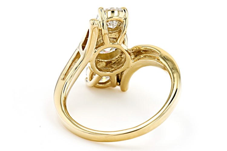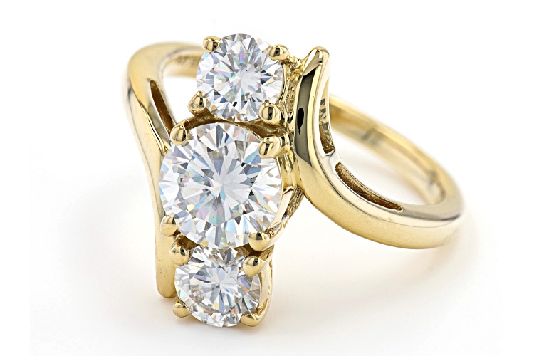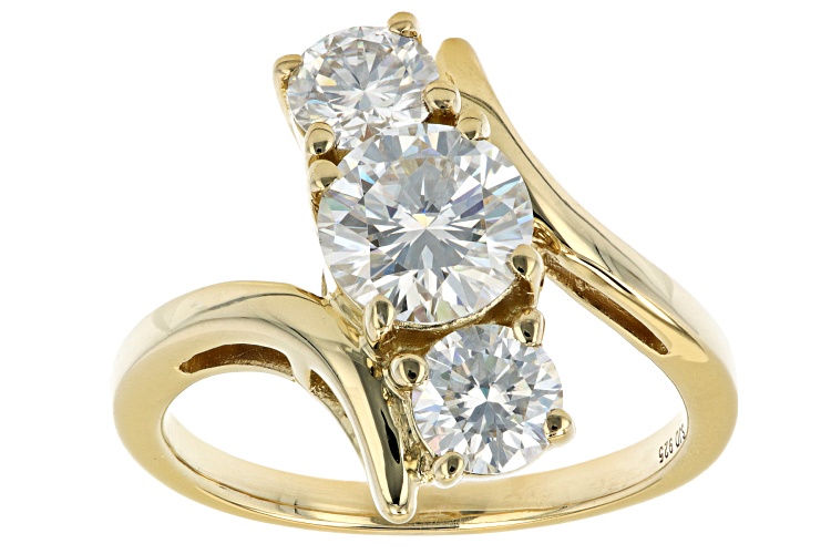 Moissanite Fire(R) 2.20ctw diamond equivalent weight round, 14k yellow gold over sterling silver three stone ring. Measures approximately 5/8" L x 1/16" W and is not sizeable. Actual moissanite weight is 1.92ctw.