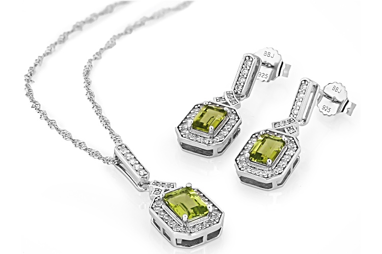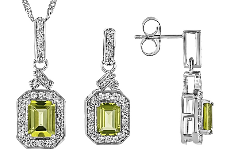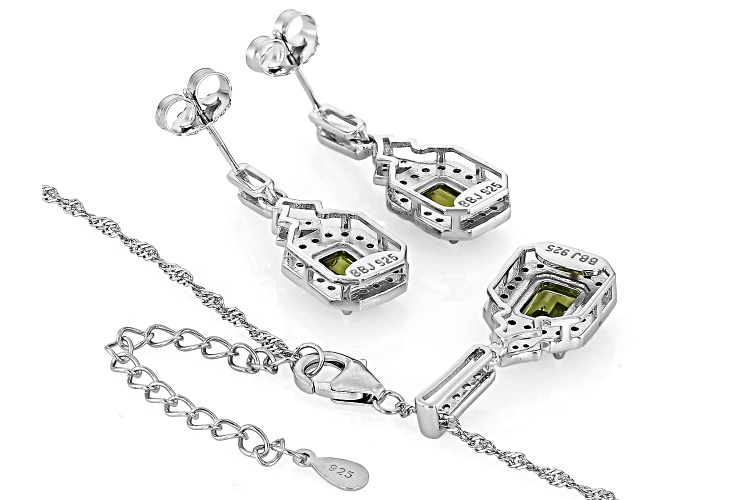 2.64ctw Manchurian Peridot™ With 0.44ctw White Zircon Rhodium Over Silver Pendant & Earrings Set