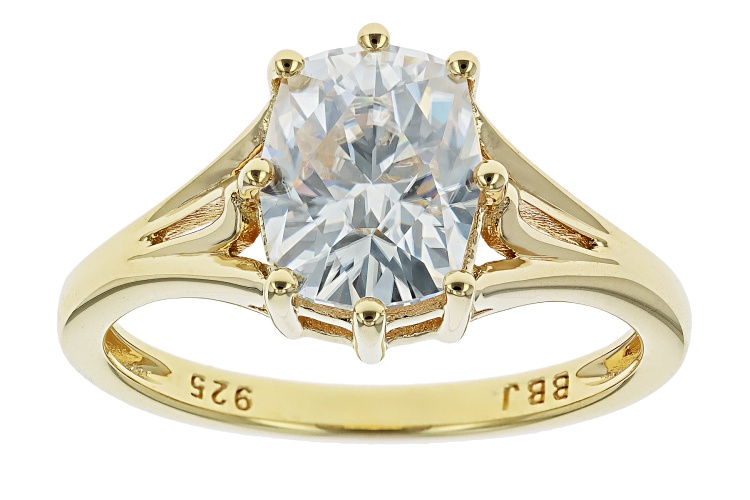 Moissanite Fire® 2.48ct DEW oval 12 sided cushion cut 14k yellow gold over sterling silver solitaire ring. Measures approximately 9/16" L x 3/8" W and is not sizeable. Actual moissanite weight is 2.25ctw.
