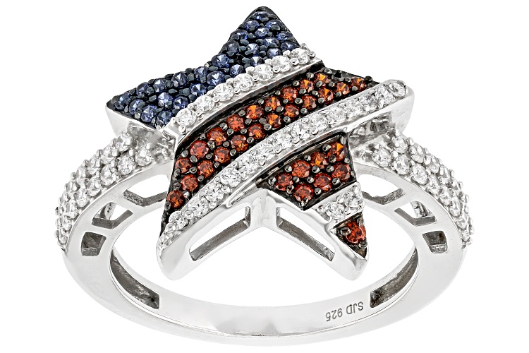 Bella Luce® Esotica™ tanzanite, ruby, and white diamond simulants 0.85ctw round, rhodium over sterling silver American flag ring. Measures approximately 0.81" L x 0.66" W and is not sizable.
