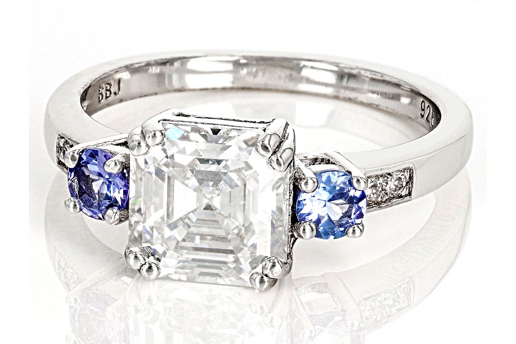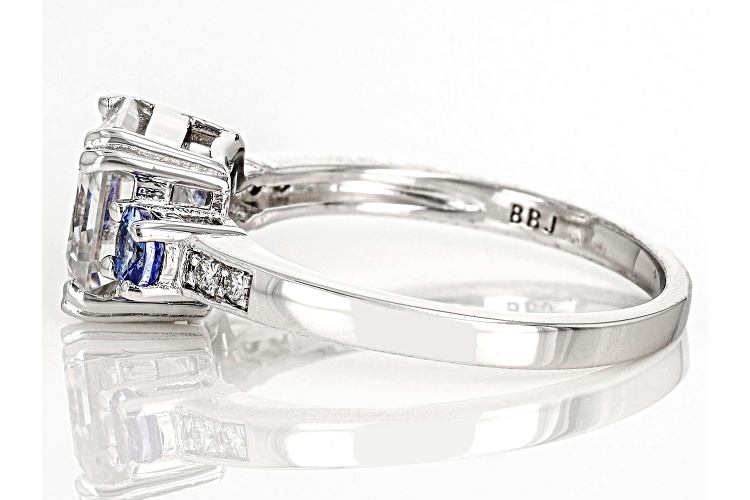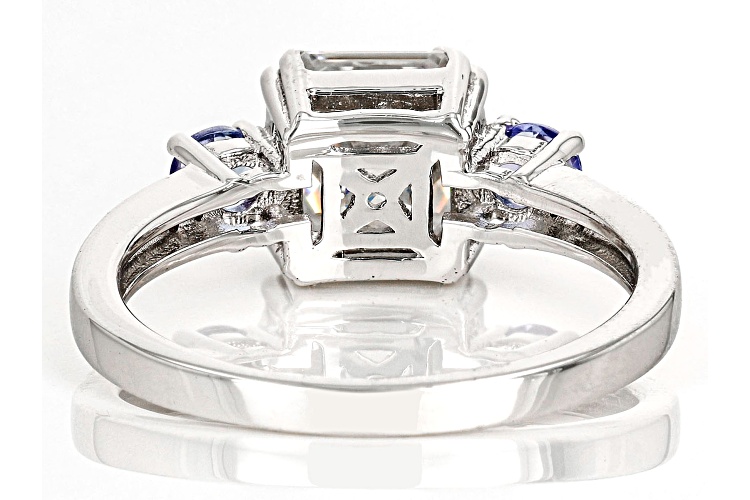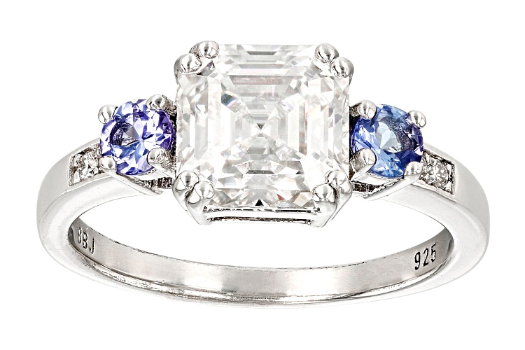 Pre-Owned Moissanite Fire® 3.00ctw diamond equivalent weight asscher cut and round with .31ctw round tanzanite Platineve® ring. Measures approximately 5/16" L x 1/16" W and is not sizeable. Actual moissanite weight is 2.29ctw. . This product may be a customer return, vendor sample, or on-air display and is not in its originally manufactured condition. It may not be new. In some instances, these items are repackaged by JTV.