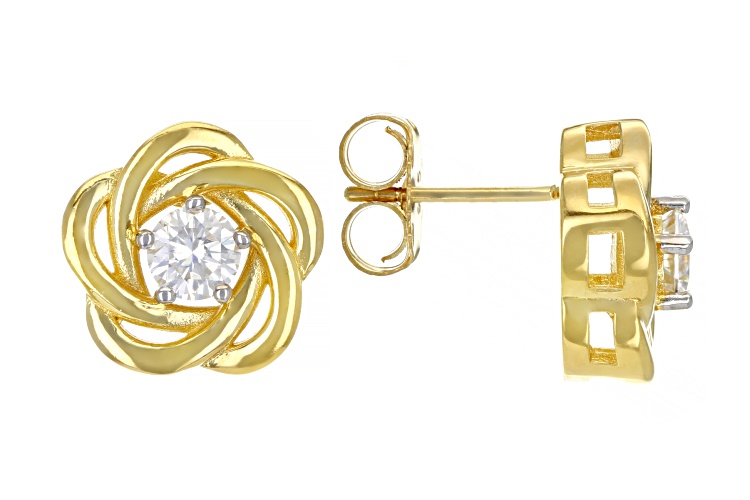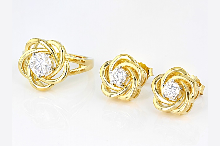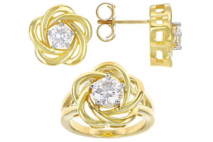 Moissanite Fire® 2.20ctw diamond equivalent weight round, 14k yellow gold over sterling silver ring and earring set. White rhodium settings. Ring measures approximately 5/8" L x 1/16" W and is not sizeable. Earrings measures approximately 9/16" L x 9/16" W and have push backs. Actual moissanite weight is 1.92ctw.