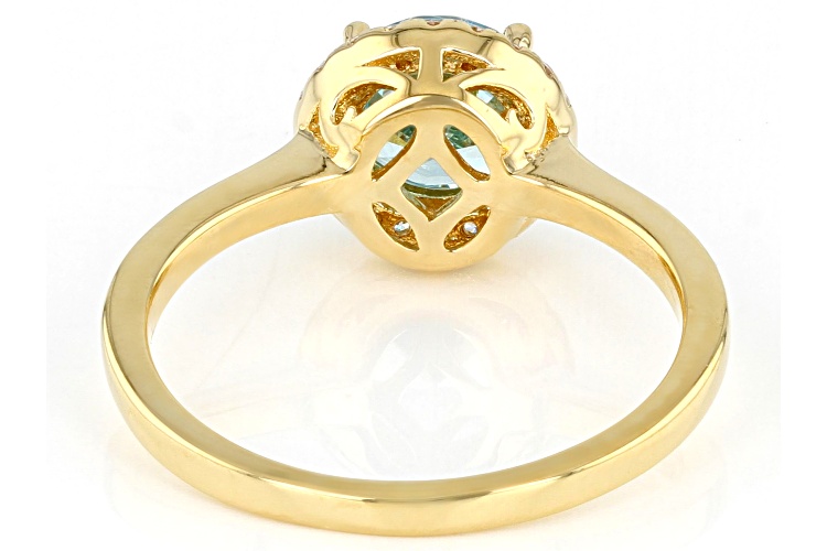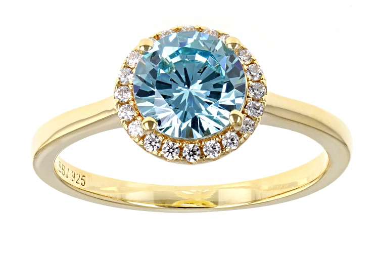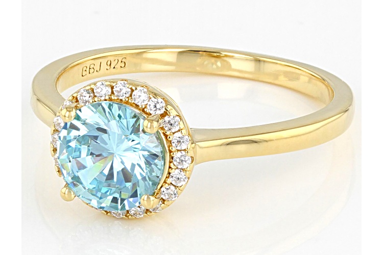 Bella Luce ® aquamarine and white diamond simulants 2.29ctw round, Eterno™ 18k yellow gold over sterling silver ring. Measures approximately 0.75" L x 0.31" W and is not sizeable.