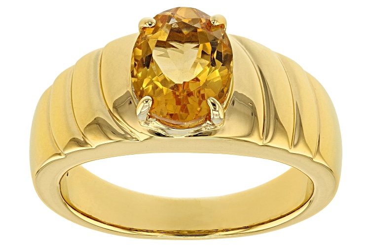 2.00ct oval Brazilian citrine solitaire, 18k yellow gold over sterling silver gent's ring. Measures approximately .32"L x .40"W. Finished under gallery. Not sizeable.