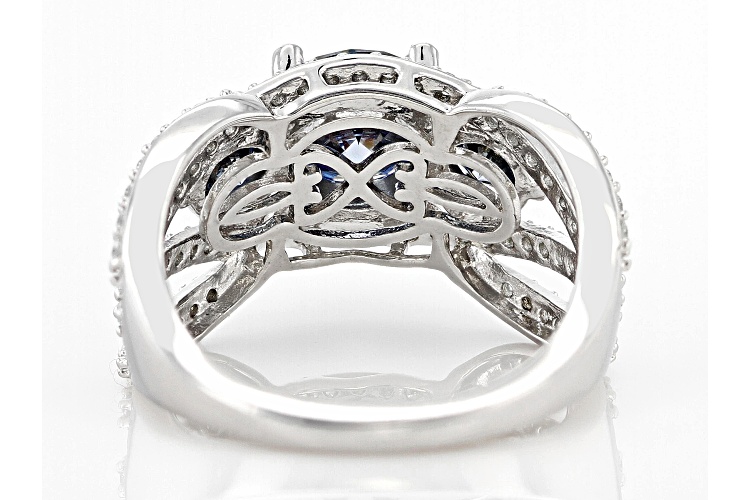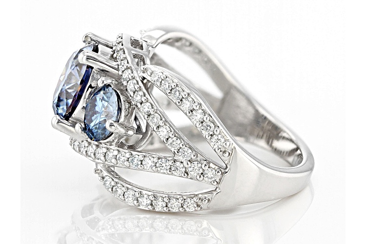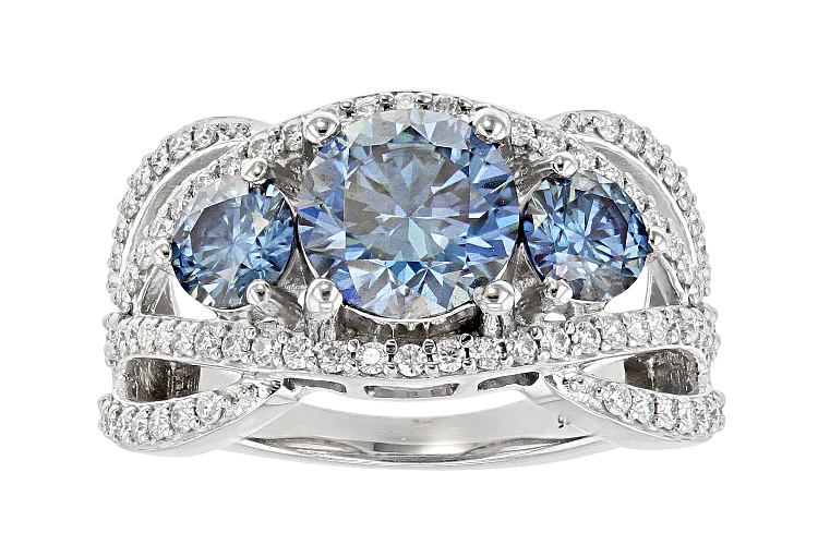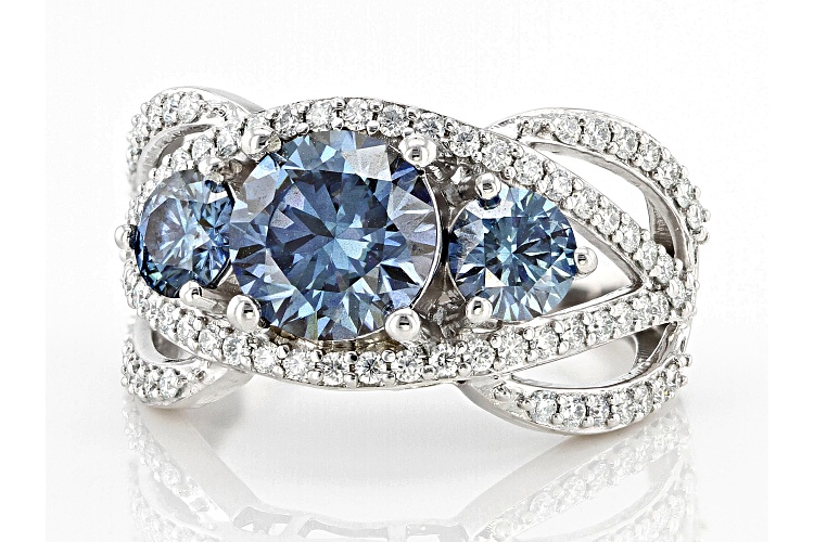 Moissanite Fire® and blue moissanite 3.68ctw diamond equivalent weight round brilliant, Platineve® ring. Measures approximately 1/2" L x 1/16" W and is not sizeable. Actual moissanite weight is 3.20ctw.