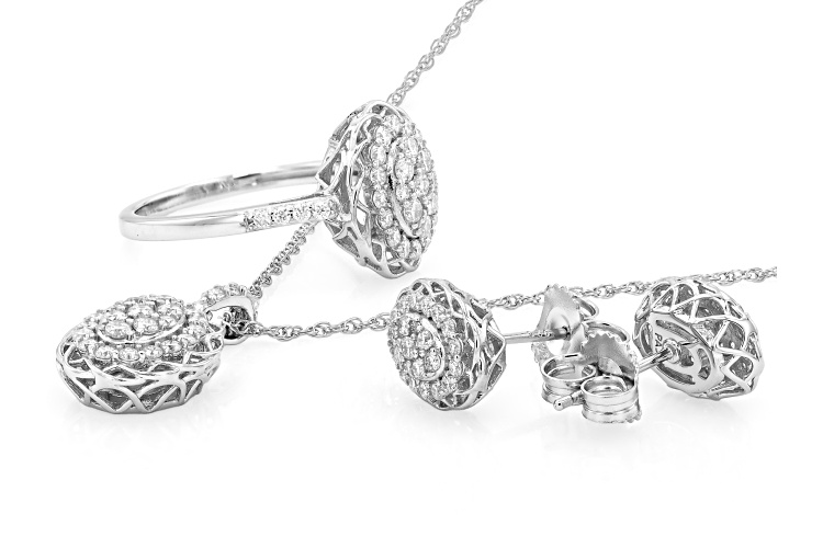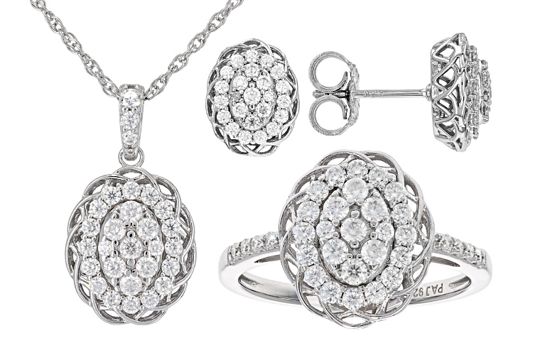 MOISSANITE FIRE® 1.74CTW DEW PLATINEVE® EARRINGS, RING, PENDANT AND CHAIN SET