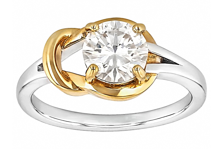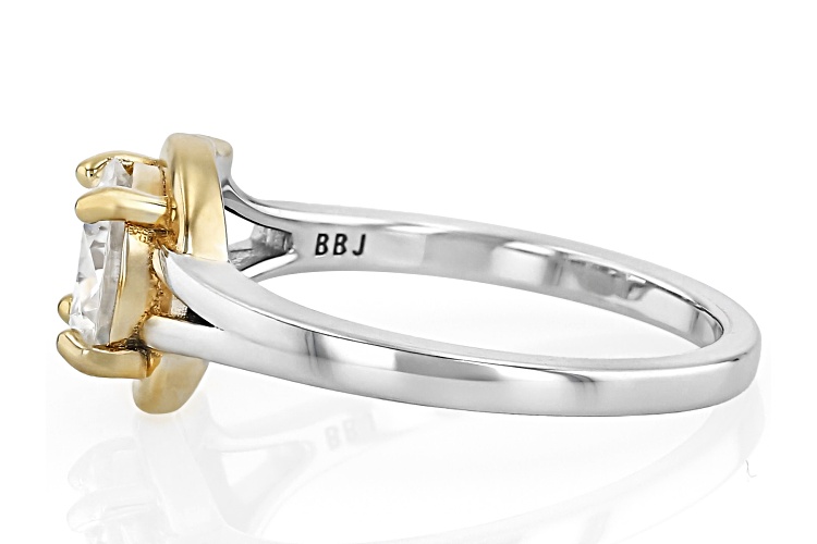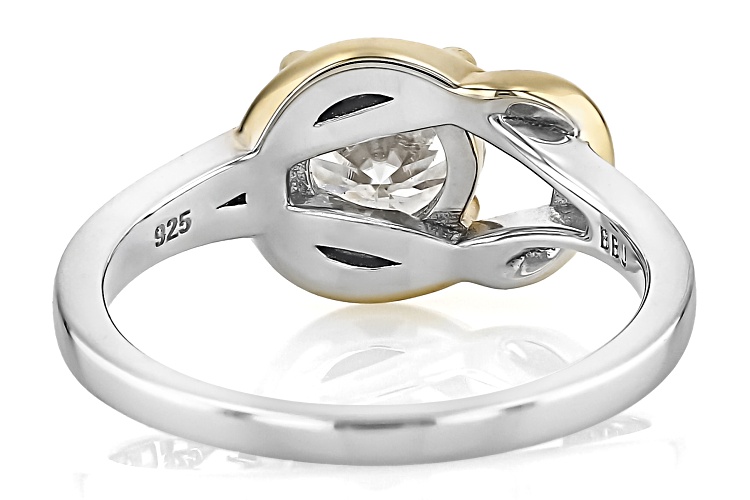 Moissanite Fire® 1.20ct diamond equivalent weight round brilliant Platineve® with 14k yellow gold over platineve two tone ring. Measures approximately 1/2" L x 5/16" W and is not sizeable. Actual moissanite weight is 1.10ct.