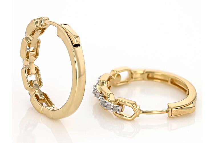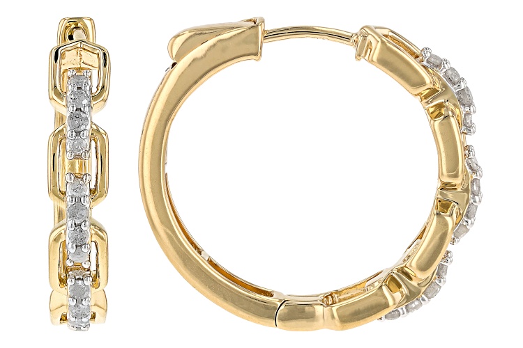 Engild™ 0.33ctw round white diamond, 14k yellow gold over sterling silver hoop earrings. Measure approximately 13/16"L x 1/8"W and have hinge with push lock backings. White rhodium enhanced settings.
