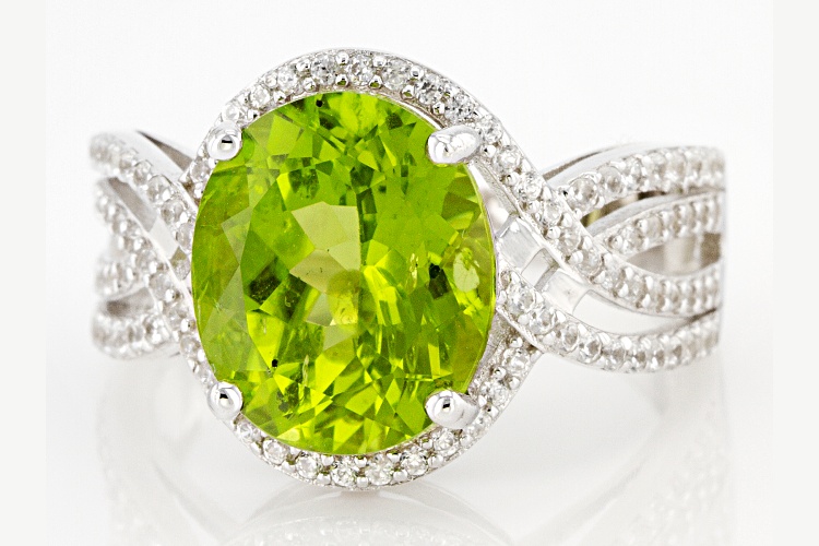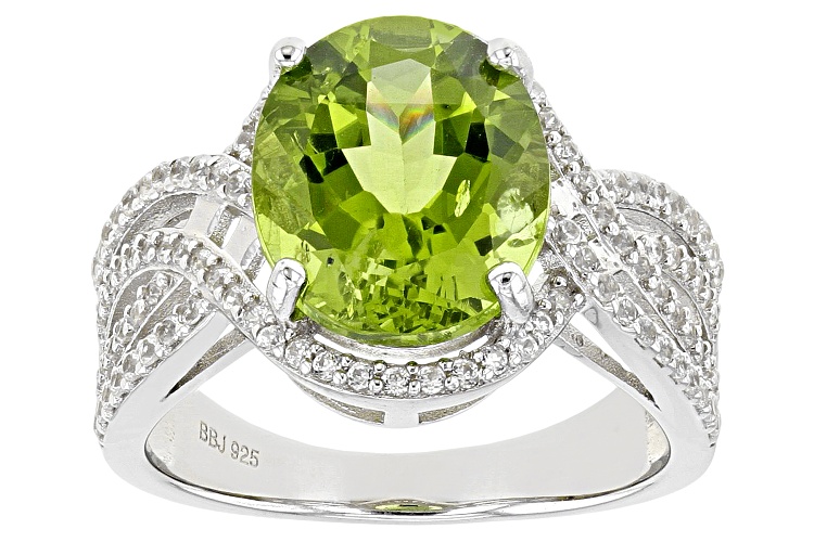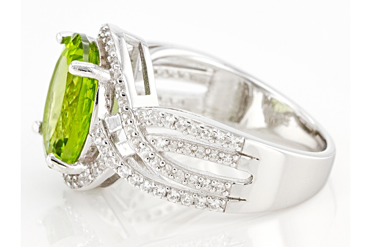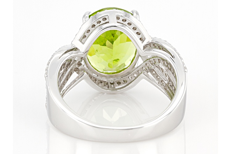 4.50ct Oval Manchurian Peridot™ With 0.57ctw Round White Zircon Rhodium Over Silver Ring - Size 6
