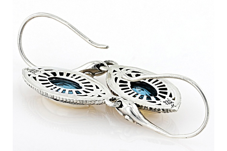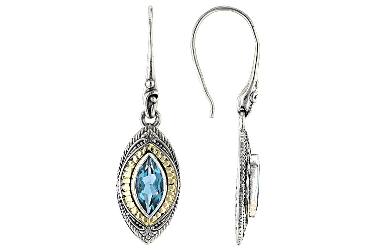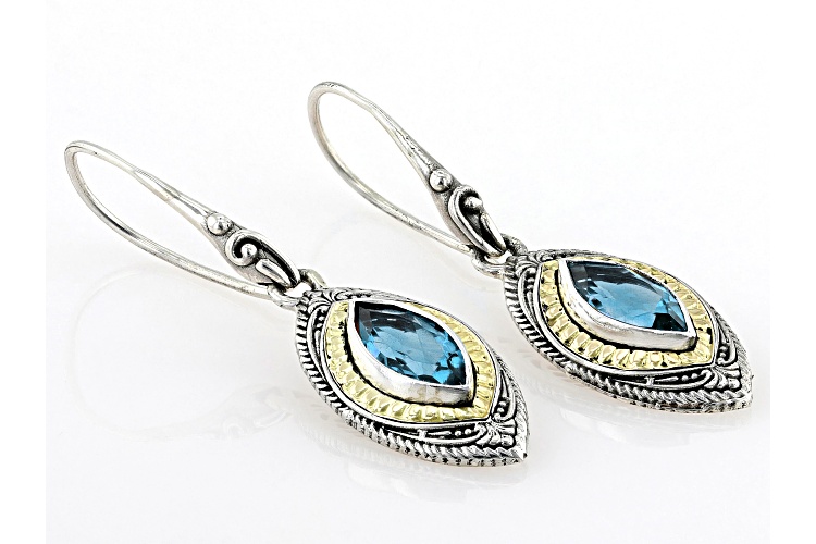 Artisan Collection of Bali™ 2.46ctw Blue Topaz Marquise Sterling Silver & 18K Gold Accent Earrings. Measures Approximately 1.45"L x 0.43"W. Fish Hook Backings. Oxidized.