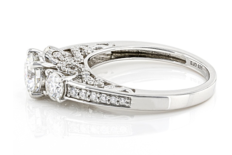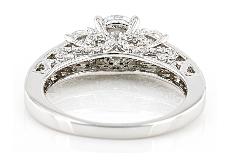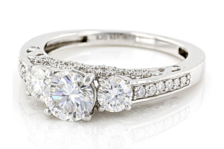 Moissanite Fire(R) 1.90ctw diamond equivalent weight round, Platineve(R) ring. Measures approximately 3/16" L x 1/16" W and is not sizeable. Actual moissanite weight is 1.76ctw.