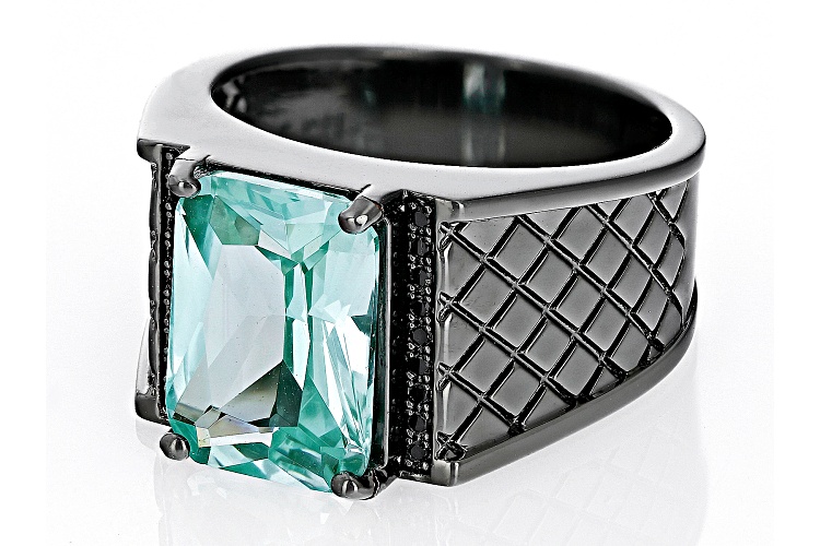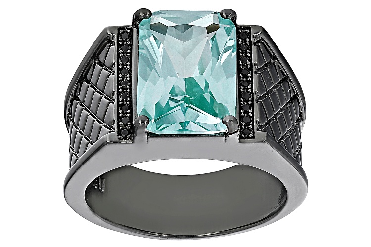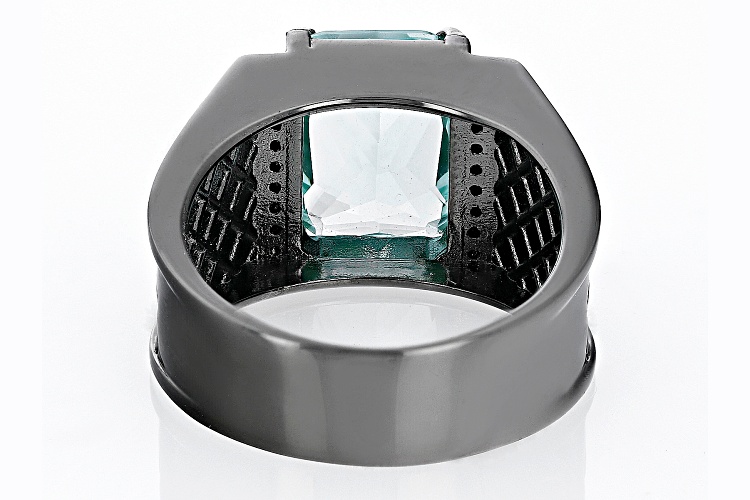 6.20ct Rectangular Octagonal Lab Created Green Spinel With 0.15ctw Round Black Spinel, Black Rhodium Over Brass Men's Ring. Measures Approximately 0.59"L x 0.56"W. Not Sizeable.