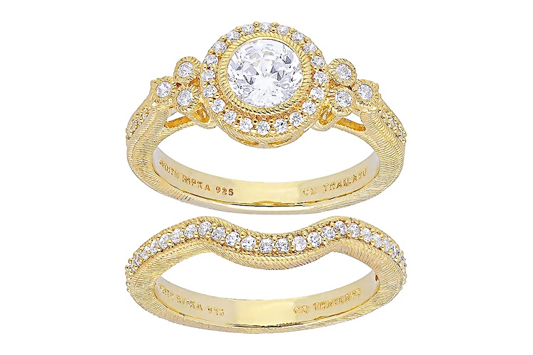 • Judith Ripka 3.26ctw Round Bella Luce Diamond Simulant 14k Gold Clad Halo Ring and Band Set - Size 11