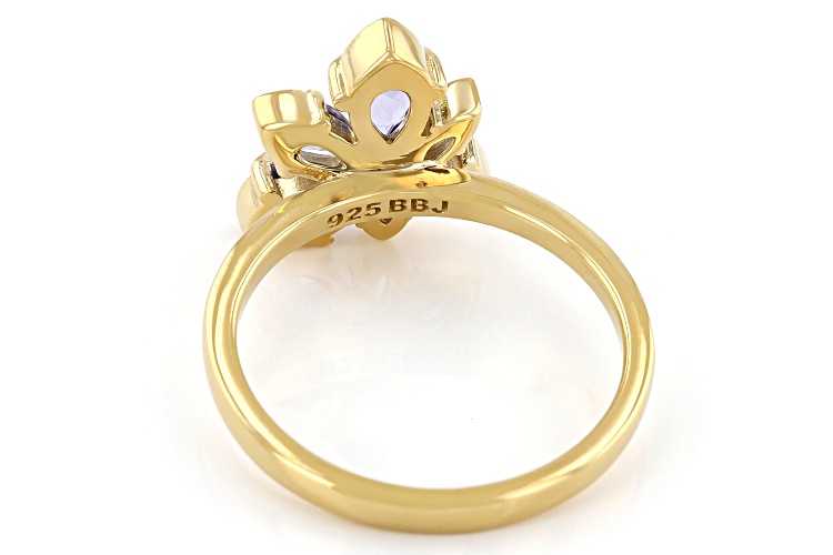 .99ctw pear shape and .12ctw marquise tanzanite 18k yellow gold over sterling silver asymmetrical flower ring. Measures approximately .48"L x .54"W. Not sizeable.