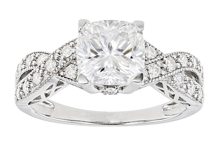 • MOISSANITE FIRE(R) 2.40CTW DEW CUSHION CUT AND ROUND PLATINEVE(R) RING - Size 8