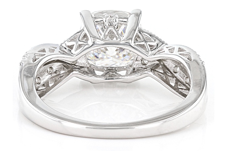 Moissanite Fire(R) 2.40ctw diamond equivalent weight cushion cut and round, Platineve(R) ring. Measures 5/16" L x 1/16" W and is not sizeable. Actual moissanite weight is 2.00ctw.