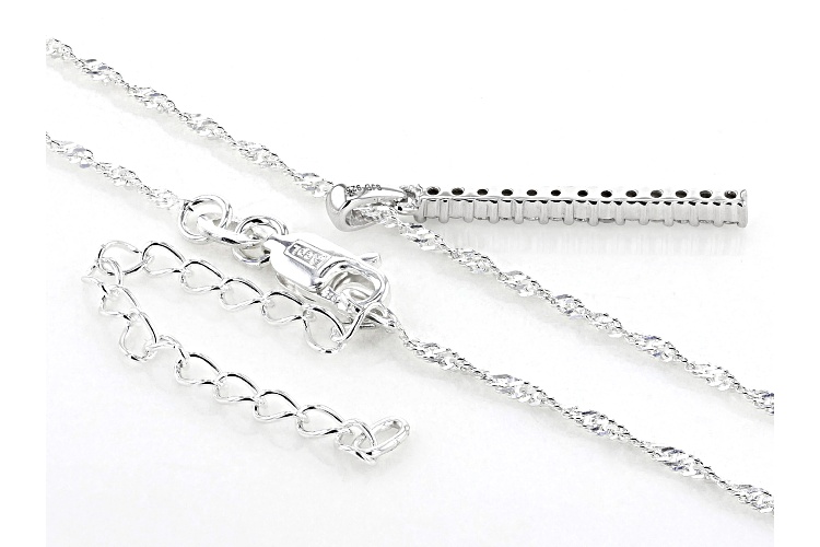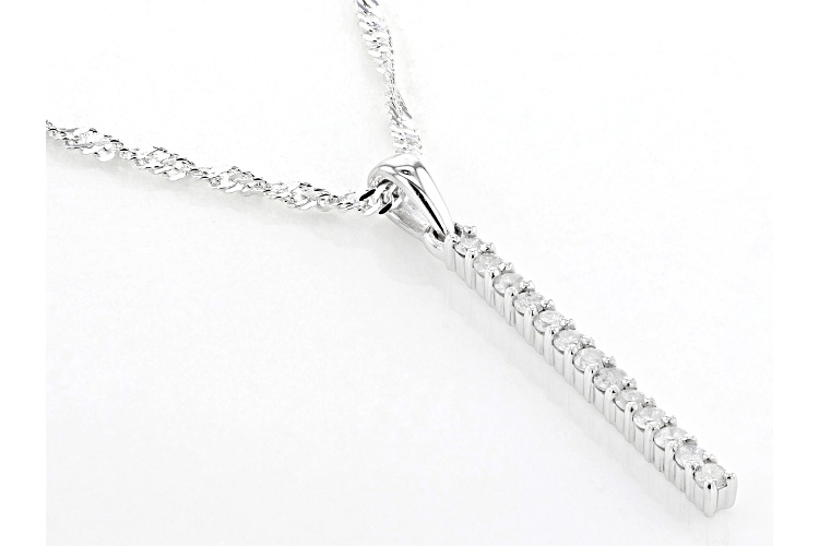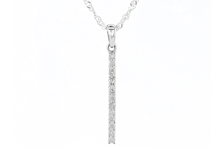0.20ctw round white diamond, rhodium over sterling silver pendant. Suspends from an 18 inch Singapore chain with a 2 inch extender and a lobster claw clasp closure. Measures approximately 1 & 1/16"L x 1/16"W and has a 1.50mm bail.