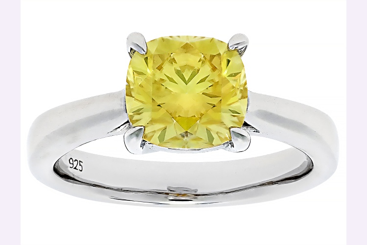 Moissanite Fire® Yellow 2.40ct diamond equivalent weight square cushion cut Platineve® ring. Measures approximately 5/16" L x 5/16" W and is not sizeable. Actual moissanite weight is 2.15ct.