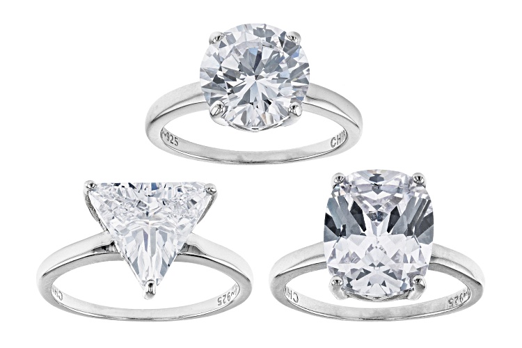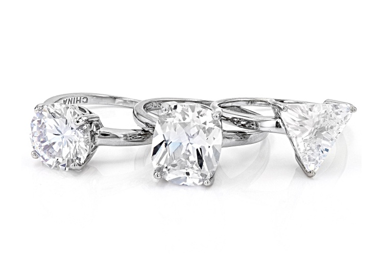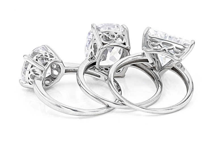 Bella Luce® white diamond simulant 17.38ctw rectangular cushion, round, and triangle, platinum over sterling silver 3 ring set. Rectangular cushion ring measures approximately 0.75" L x 0.50" W. Round ring measures approximately 0.81" L x 0.38" W. Triangle ring measures approximately 0.81" L x 0.44" W. Rings are not sizable. Diamond equivalent weight is 10.53ctw.