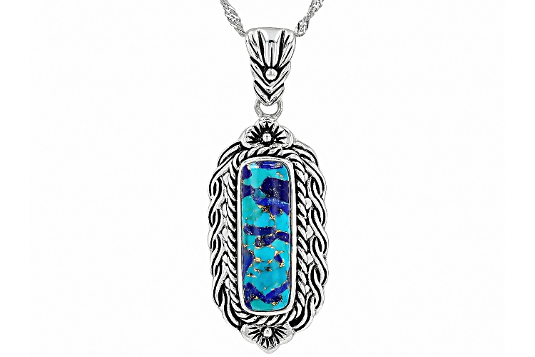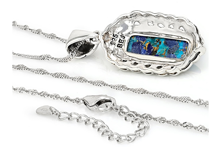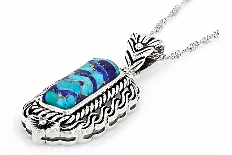 20x6mm Rectangular Cabochon Turquoise And Lapis Lazuli Sterling Silver Pendant With Chain