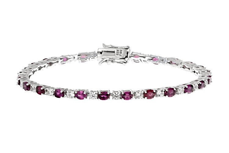 4.49ctw Oval Raspberry Rhodolite With 2.04ctw Round White Zircon Rhodium Over Sterling Silver Tennis Bracelet. Measures Approximately 0.12"W. Box clasp Closures. Accents stone primarily zircon.