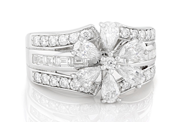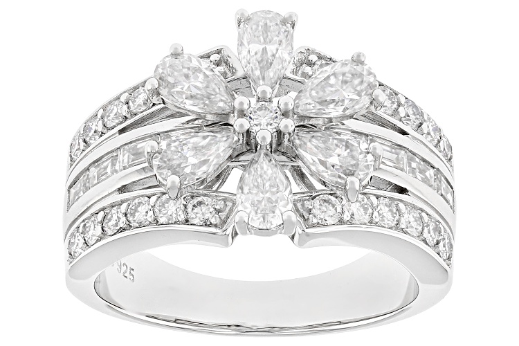 • MOISSANITE FIRE® 1.79CTW DEW ROUND BRILLIANT, PEAR SHAPE AND BAGUETTE PLATINEVE® RING - Size 7