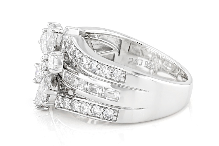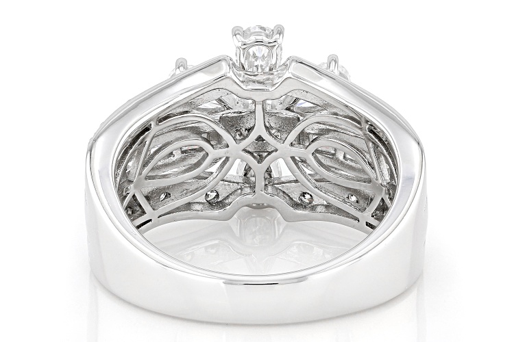Moissanite Fire® 1.79ctw diamond equivalent weight pear shape and round brilliant with baguette, Platineve® ring. Measures approximately 13/16" L x 1/2" W and is not sizeable. Actual moissanite weight is 1.79ctw.