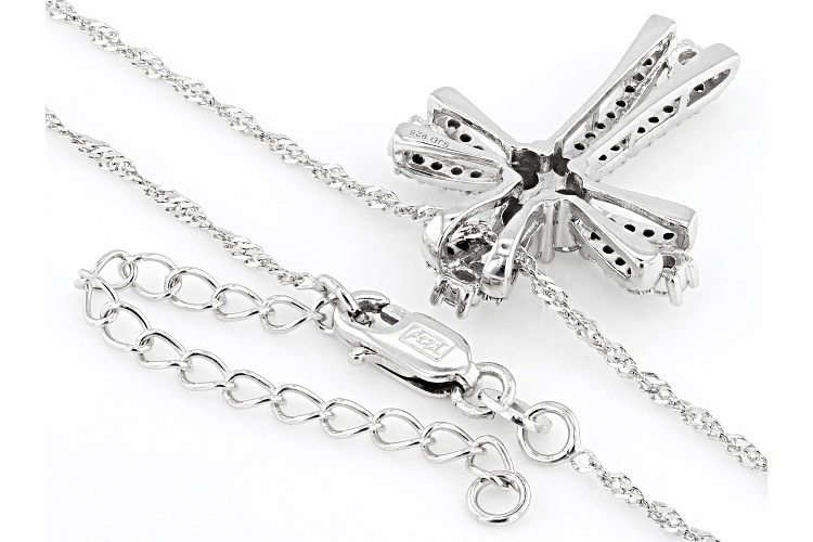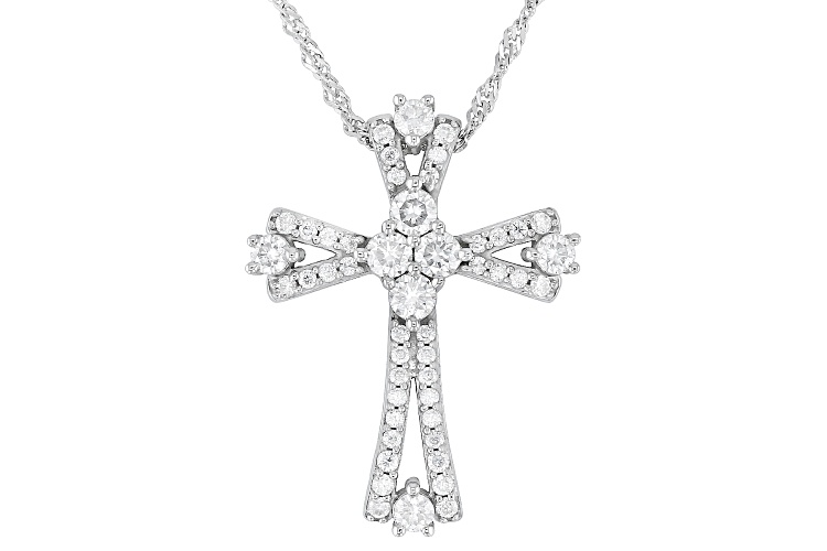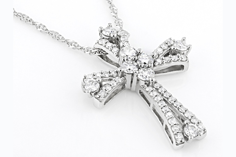 Moissanite Fire® 1.04ctw diamond equivalent weight round, Platineve® cross pendant with 18 inch Singapore chain. Measures approximately 1 & 1/16" L x 13/16" W and has a lobster clasp and two inch extender. Actual moissanite weight is .96ctw.