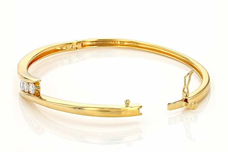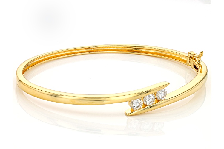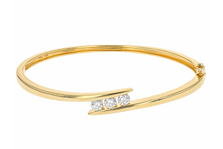 Moissanite Fire(® .99ctw diamond equivalent weight round, 14k yellow gold over silver bangle bracelet. Measures approximately 7 & 1/4" L x 5/16" W and has a box clasp with stainless steel tongue. Actual moissanite weight is .87ctw.