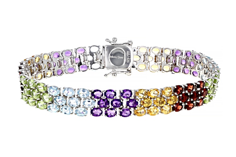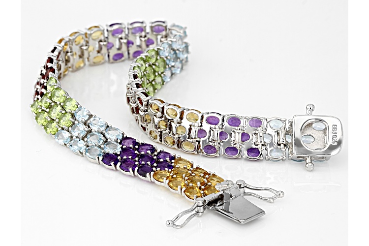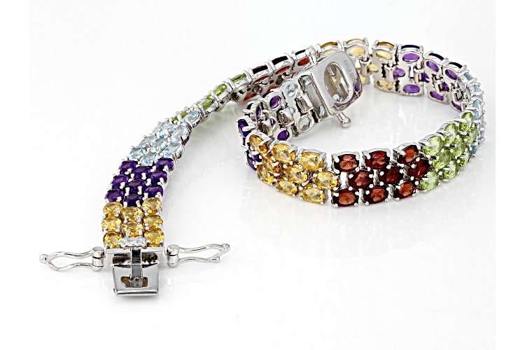 4.82ctw Oval Sky Blue Topaz With 3.52ctw Oval Vermelho Garnet™, 3.44ctw Oval Citrine, 3.44ctw Oval African Amethyst and 2.91ctw Oval Manchurian Peridot™ Rhodium Over Sterling Silver Bracelet. Measures Approximately 72"L X 0.36"W. Hidden Box Clasp Closure With Stainless Steel Closure