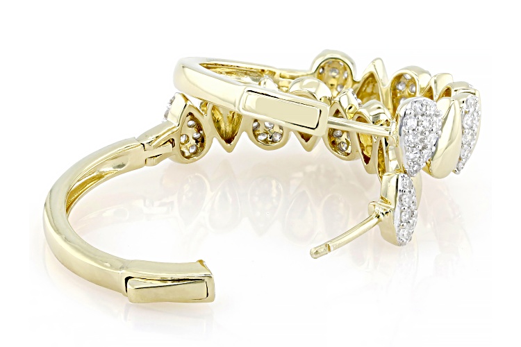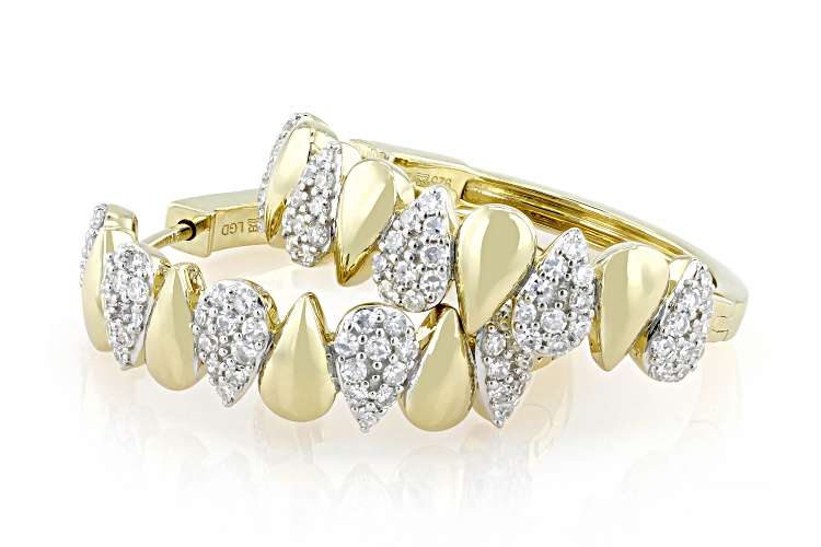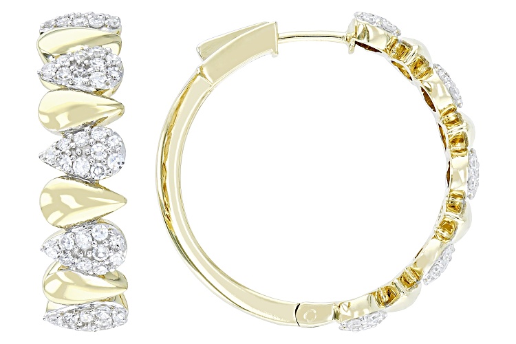 Prazana® Lab-Grown Diamonds 1.00ctw round white lab-grown diamond, 14k yellow gold over sterling silver hoop earrings. Measure approximately 1"L x 1/4"W and have hinge with push lock backings. Rhodium enhanced prongs. G color, SI clarity minimum.
