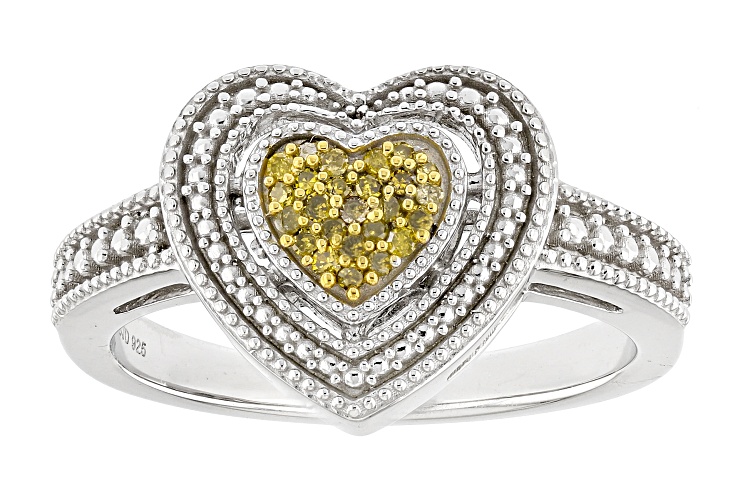 0.10ctw round yellow diamond, rhodium over sterling silver heart cluster ring. Measures approximately 7/16"L x 7/16"W and is not sizeable. 14k yellow gold plated prongs around the yellow diamonds.